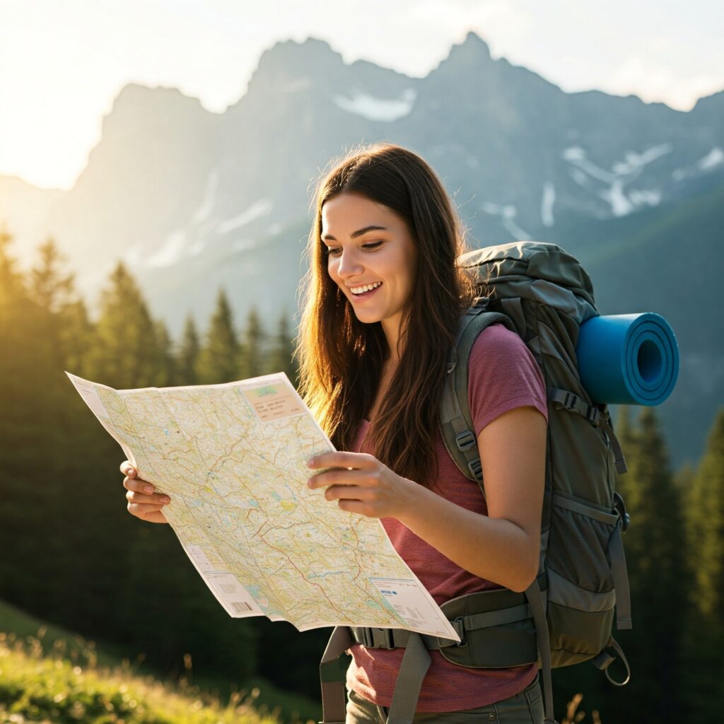 Una persona con una mochila azul vibrante y un clásico botiquín de primeros auxilios rojo está de pie atentamente frente a un mapa antiguo y descolorido del mundo. El mapa del mundo está lleno de pequeñas banderas y pegatinas, que muestran una colección de lugares planeados y visitados. La persona tiene una mirada contemplativa y una expresión neutral con una sutil sonrisa que insinúa emoción por su futuro viaje. La persona lleva ropa informal, adecuada para viajar. Una luz suave y natural se proyecta sobre la persona y el mapa antiguo, creando un ambiente cálido y acogedor. Hay un sutil efecto bokeh en el fondo, que destaca el mapa y la persona que está de pie frente a él. La imagen en general es de viaje, exploración y preparación para aventuras en tierras desconocidas.